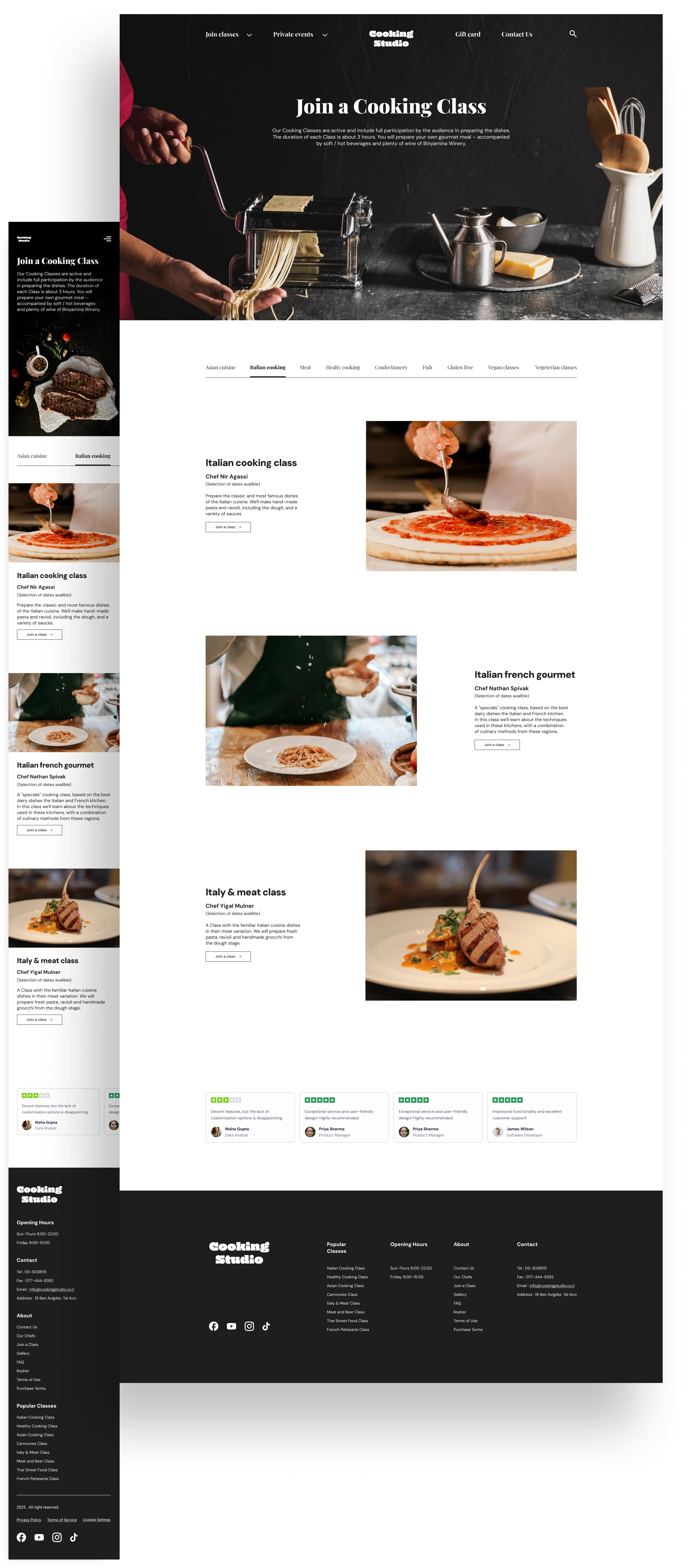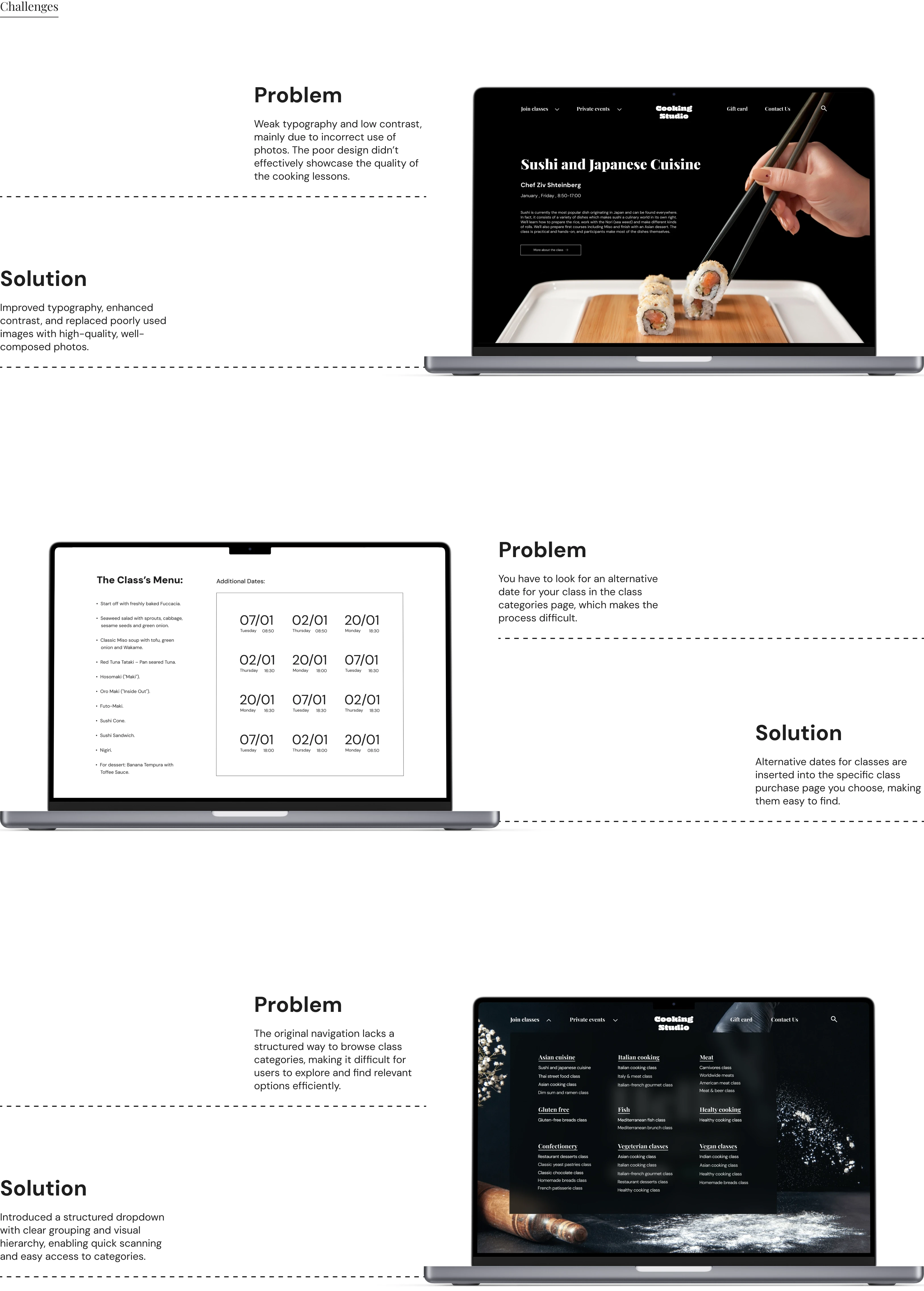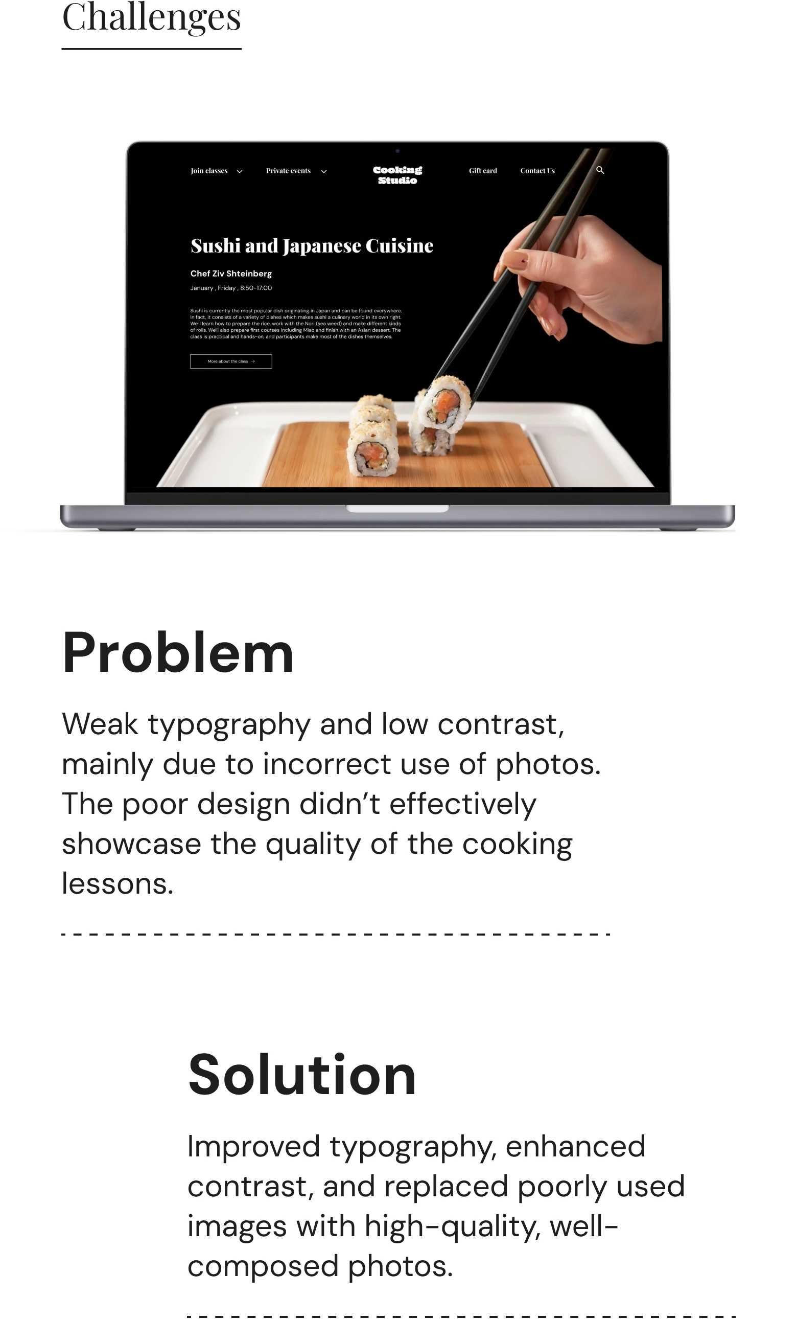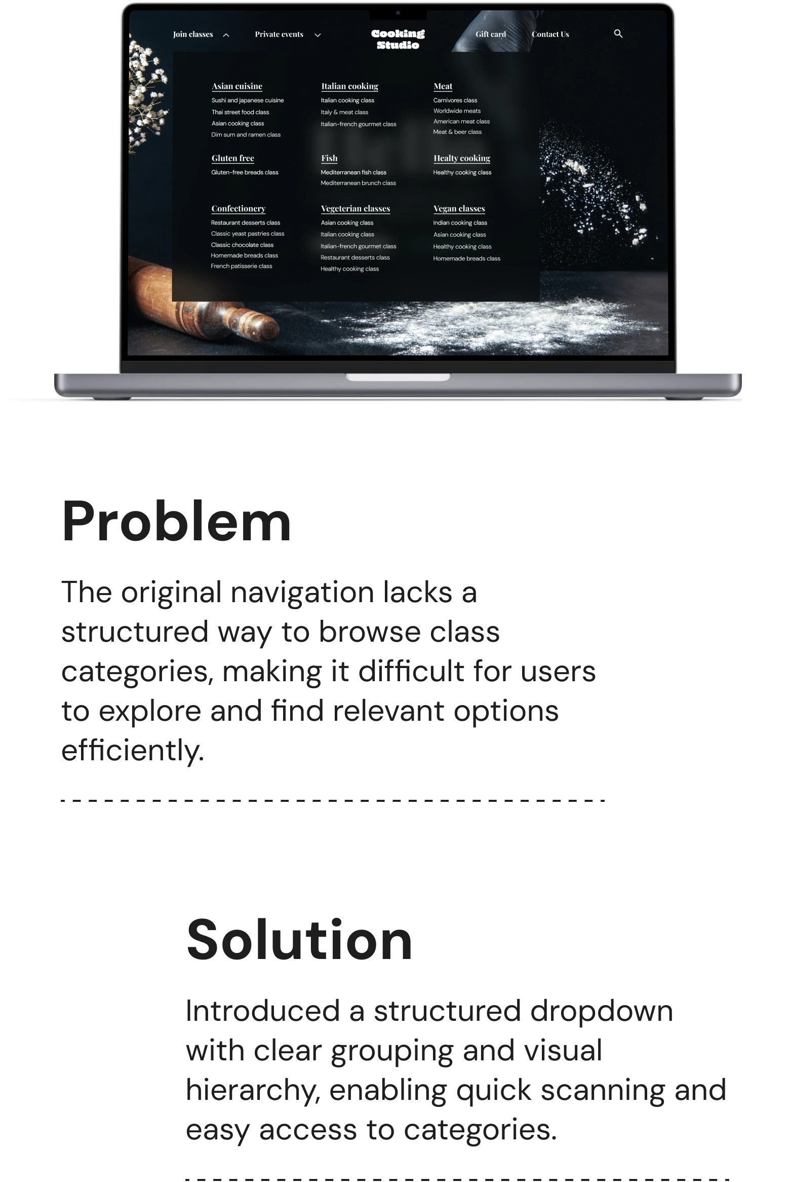 Cooking Studio is a redesigned cooking lessons website that offers in-person classes with professional chefs. It improves user experience by enhancing navigation, booking, and creating a more intuitive, visually appealing interface.
