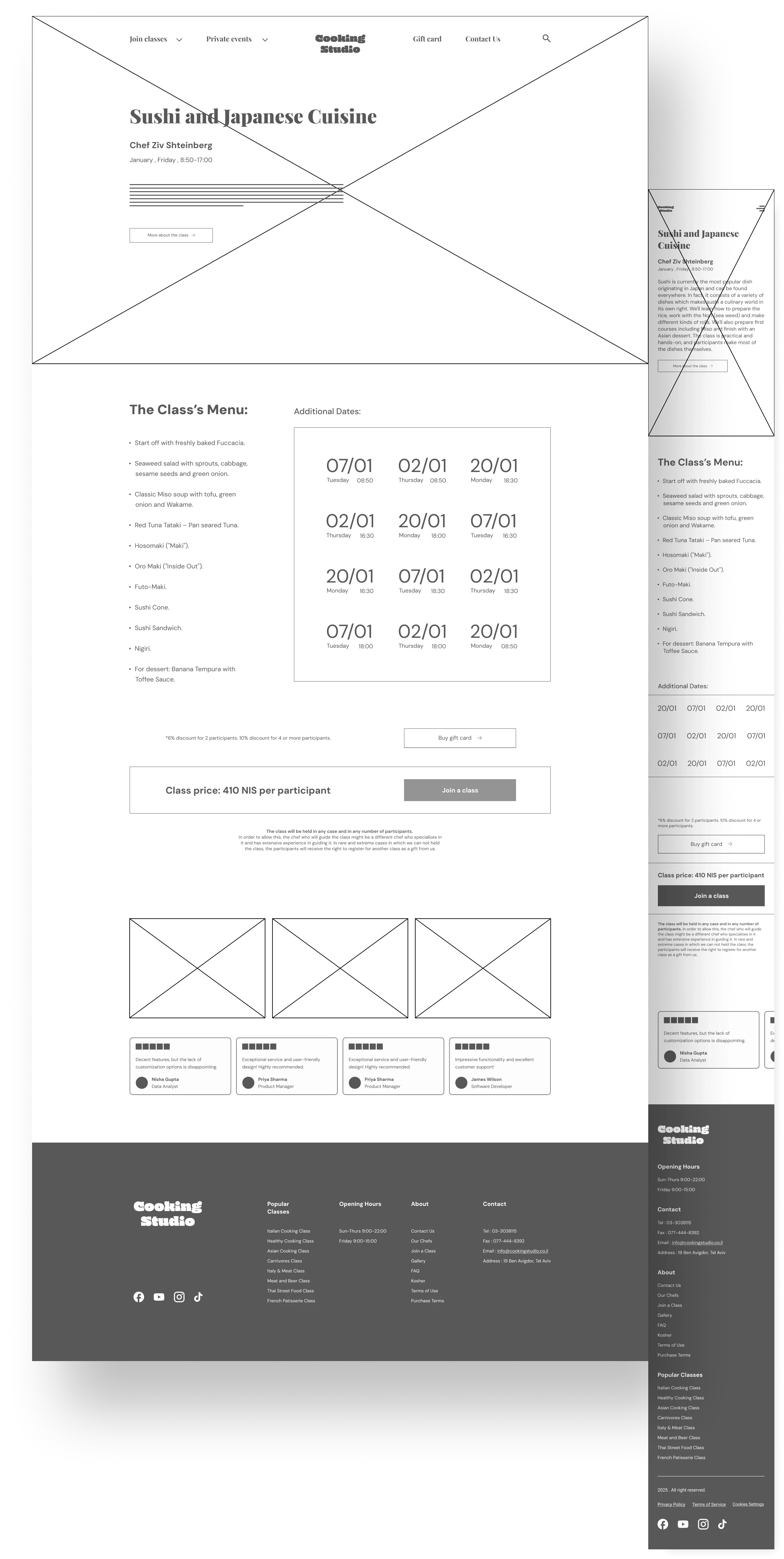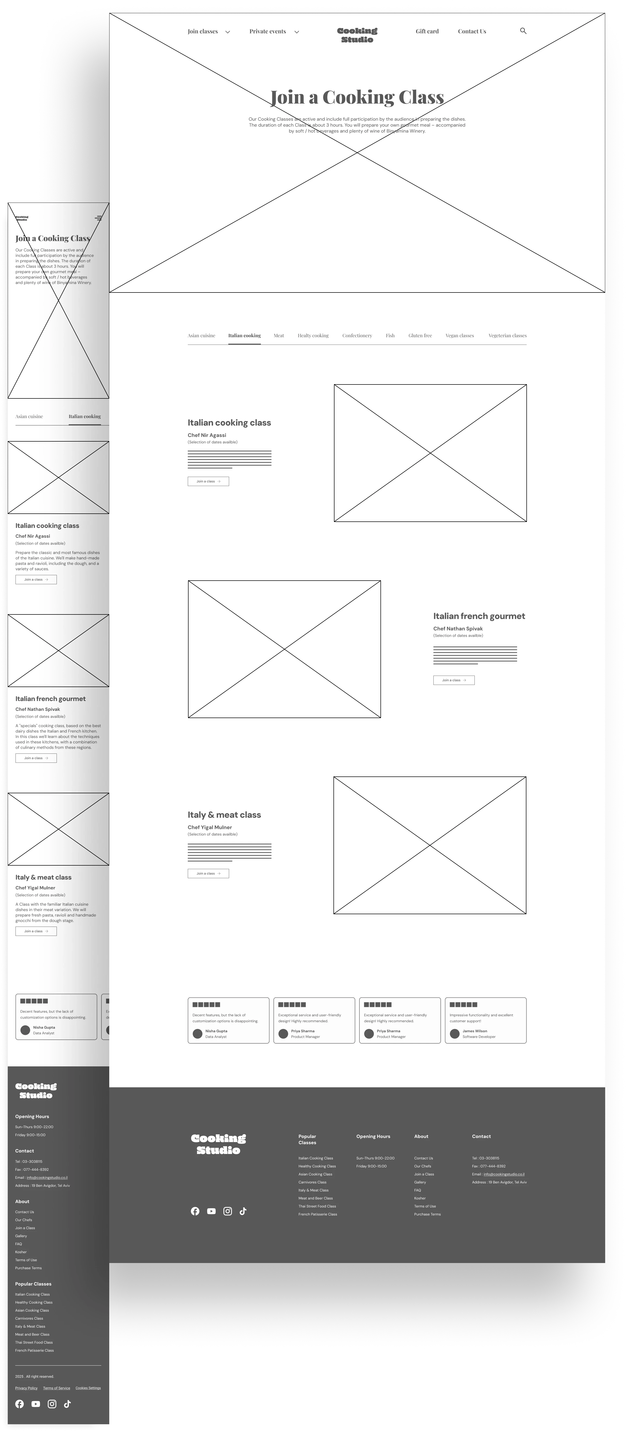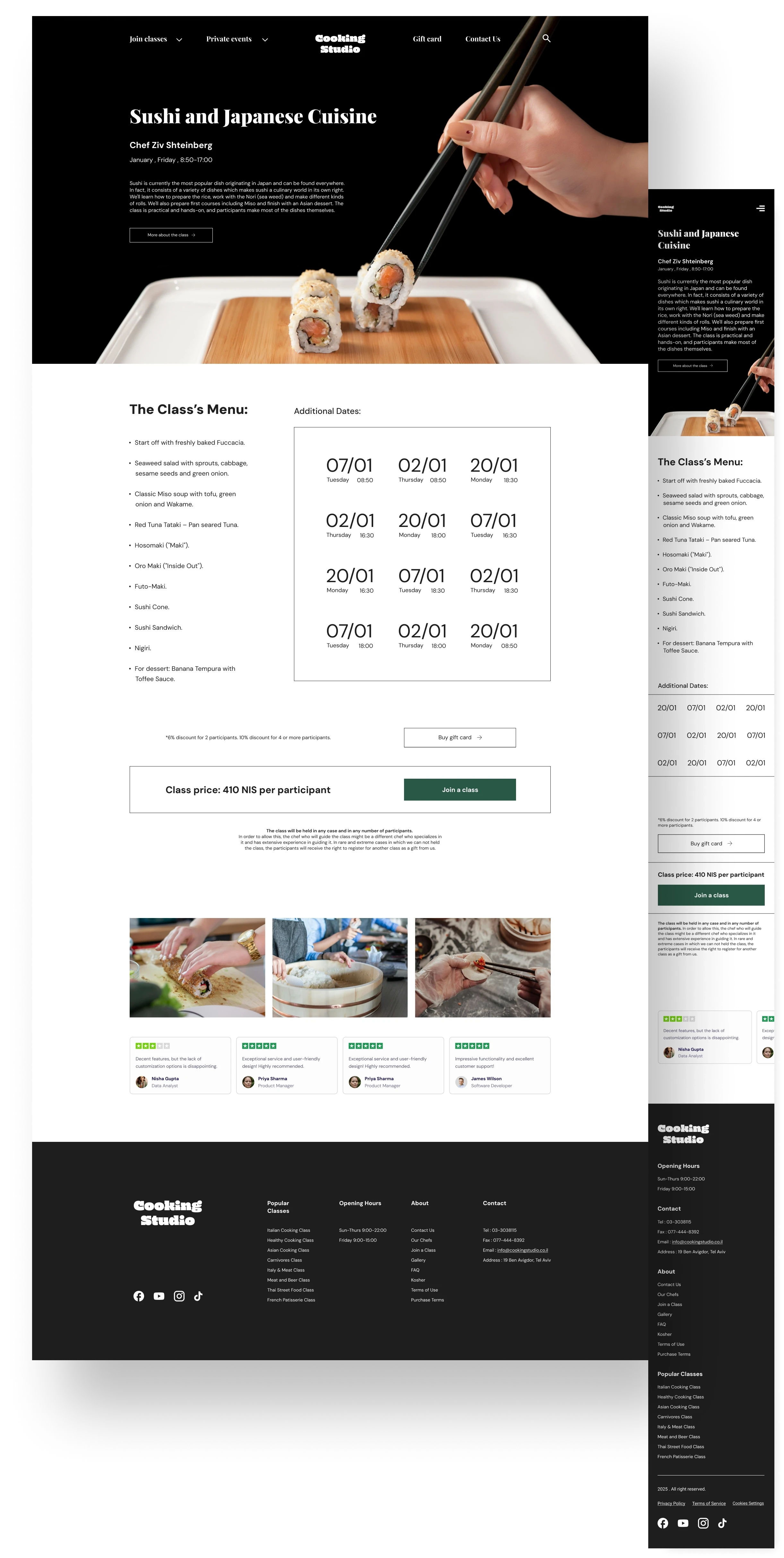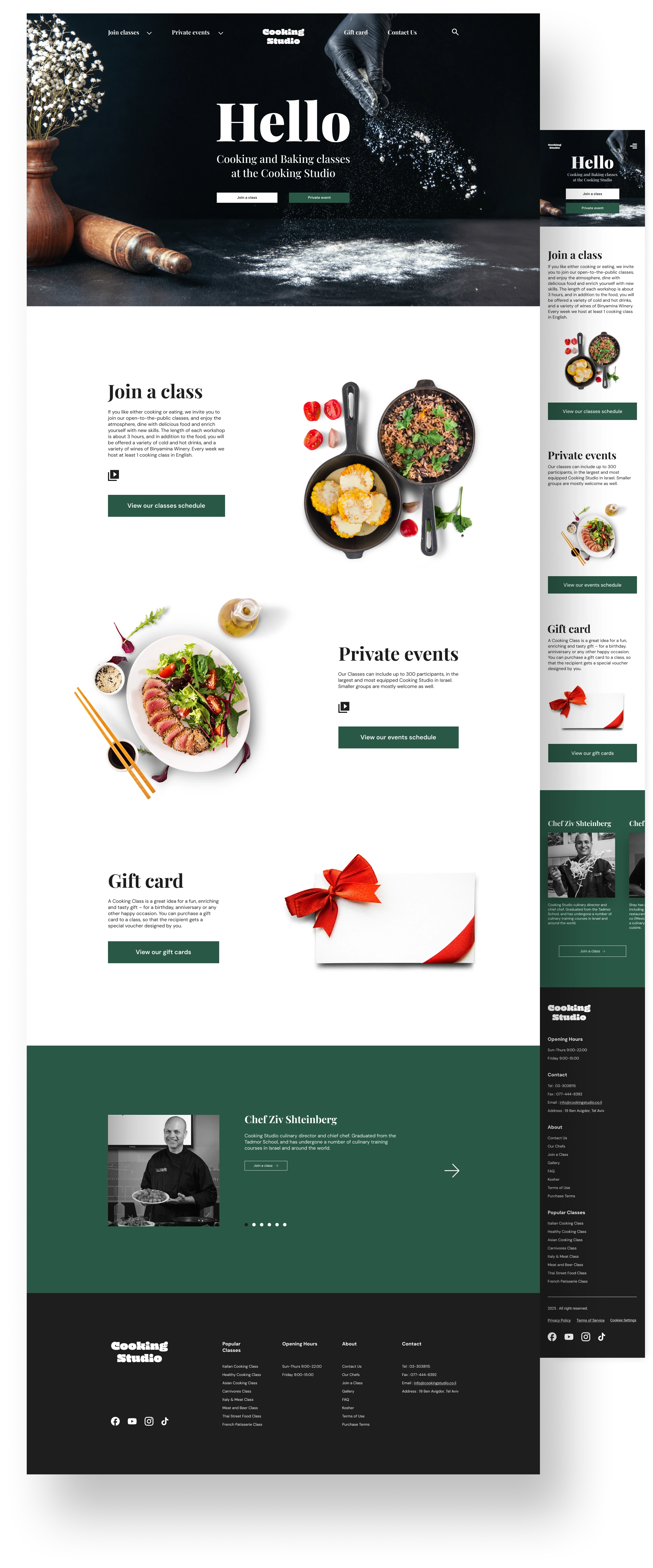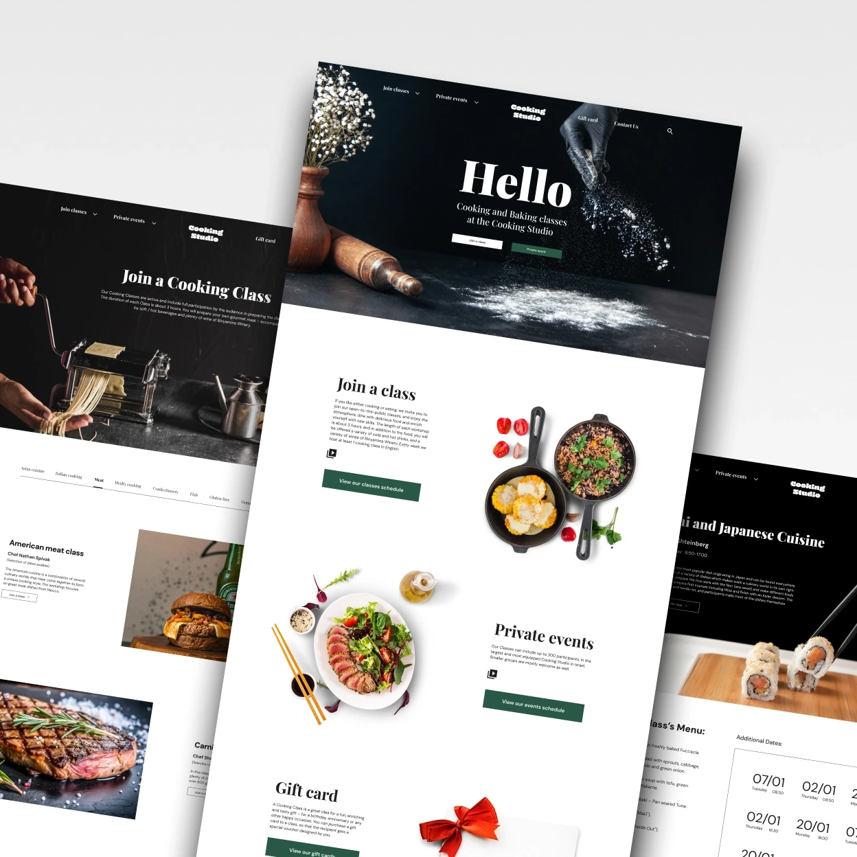 Cooking Studio is a redesigned cooking lessons website that offers in-person classes with professional chefs. It improves user experience by enhancing navigation, booking, and creating a more intuitive, visually appealing interface.